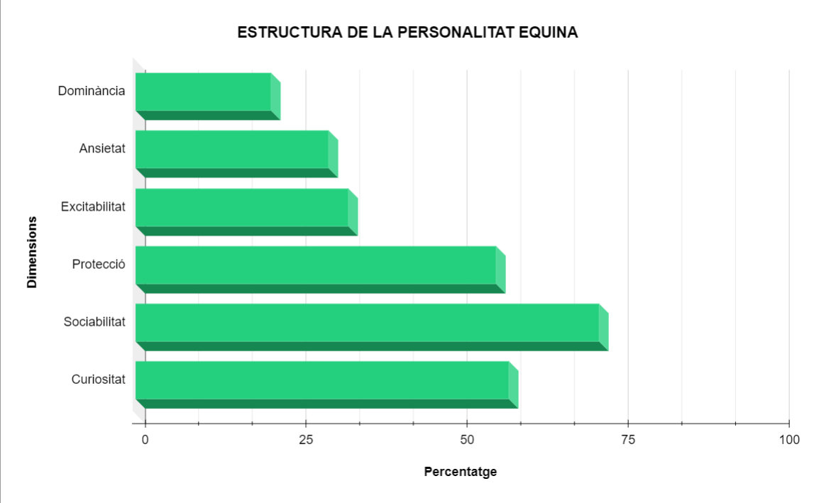 És un cavall curiós i afectuós, amb tendència a establir vincles forts, especialment amb el Falco. Té un caràcter noble i dòcil, sense maldat, i no és un animal dominant dins del grup. Mostra bon cap i capacitat d’adaptació, tot i que pot variar segons el dia. En situacions noves pot mostrar-se una mica poruc, però habitualment és tranquil si es treballa amb calma. Quan se’l pressiona en excés pot reaccionar rebotant-se puntualment, fet que indica que respon millor a un maneig pacient i coherent que no pas a la pressió intensa. És juganer, li agrada interactuar, pot mossegar de manera lúdica i mostrar-se una mica trapella. També pot tenir moments de mandra o certa deixadesa en el treball si no està prou motivat. A l’inici era considerat el més complicat.