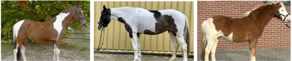 També existeixen capes amb taques, com la pía (tobiano/pío), on es combinen zones blanques amb zones de color (negre, castany, etc.). Aquest patró acostuma a formar grans taques blanques ben delimitades, sovint amb les potes clares i taques que poden travessar el llom. Tot i que és una capa molt vistosa i fàcil de reconèixer, no és de les més habituals dins el PRE, i per això pot cridar més l’atenció quan apareix en algunes línies de cria.